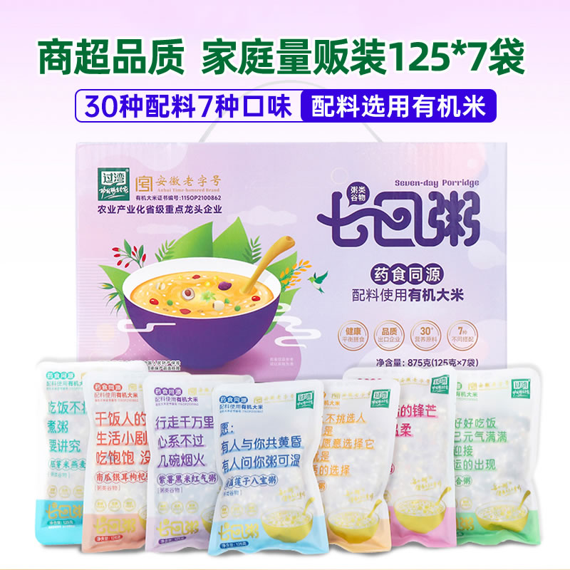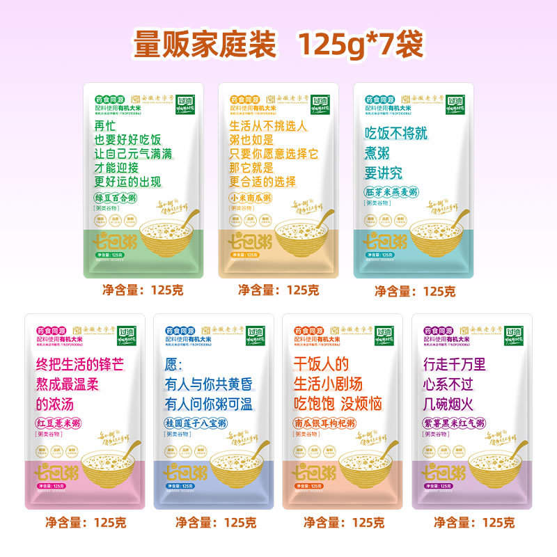 紫薯黑米紅氣粥、胚芽燕麥粥、綠豆百合粥、小米南瓜粥、桂圓蓮子八寶粥、紅豆薏米粥、南瓜銀耳枸杞粥