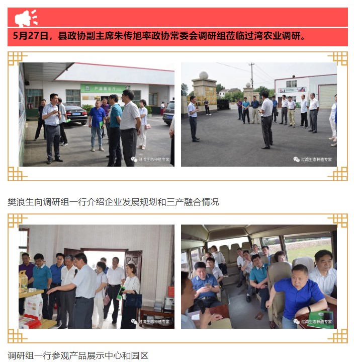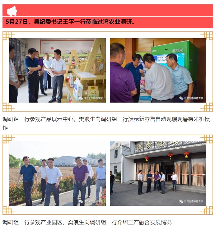 2020年6月5日,懷寧縣縣委常委、副縣長袁維錫,縣委組織部,縣財政局,縣人社局,縣交通局,縣農業農村局,縣扶貧辦等單位負責同志和業務骨干一行蒞臨過灣農業考察,舒城縣委常委、副縣長姚平松,縣扶貧局黨組書記、局長張永宏,縣扶貧局黨組副書記、副局長楊堯武等領導陪同。