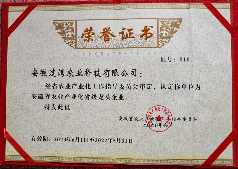 經省農業產業化工作指導委員會審定,安徽過灣農業科技有限公司被認定為安徽省農業產業化省級龍頭企業!這是繼2016年以來,過灣農業第二次獲此殊榮。